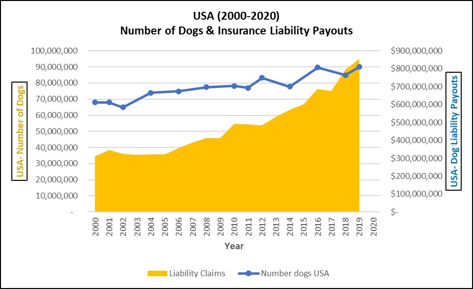 From 2000-2019 the number of dog ownerships rose from 68m to 90 million, over the same period insurance liability payouts have risen from $300m to $900 million (the number of claims is about 16,000 claims per year, however the payouts have tripled!). This suggests lawyers are cashing in on this phenomenon and insurance premiums will obviously increase in response.