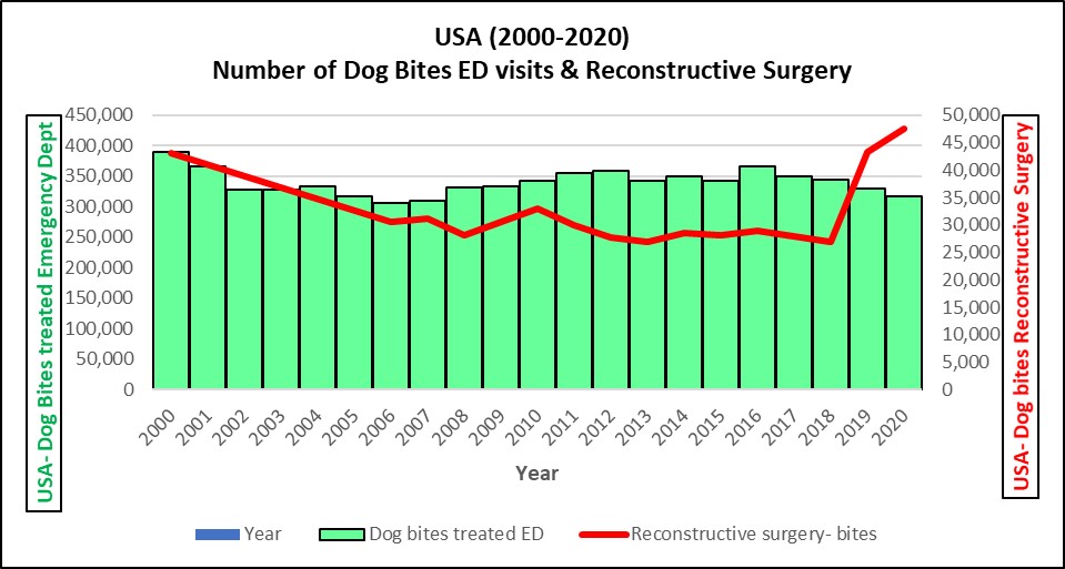 USA actually does have a useable national database, compiled by the CDC, of patients presenting to the Emergency Department (ED) with dog bites, while the ASPS tables annual reconstructive surgery of dog-bite victims.
